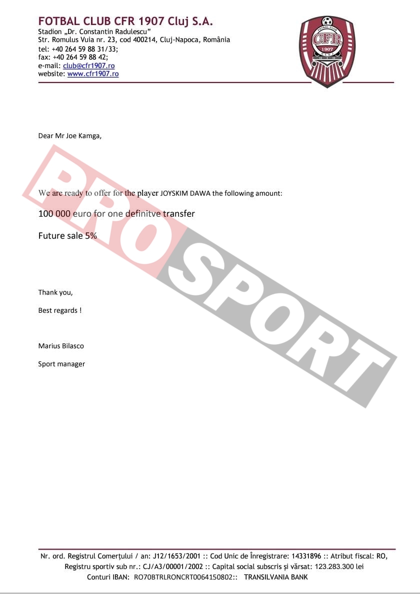 ProSport vă prezintă dovada prin care se vede clar că CFR Cluj face o ofertă de transfer pentru Joyskim Dawa, deși oficialii campionilor ne-au dezvăluit public că fundașul central de la FC Botoșani nu a fost niciodată o țină pentru ei.