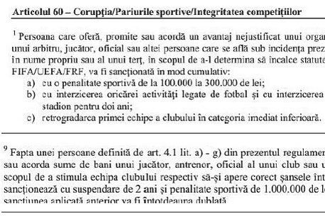 Faptele de care este acuzat Gigi Becali se încadrează, judecând din punctul de vedere al regulamentului mai devreme menționat, la Articolul 60, punctele 1 și 9 (foto dreapta). Dacă la punctul 9 lucrurile sunt clare, sancțiunile fiind îndreptate numai către persoana care „promite, oferă sau acordă sume de bani unui jucător, antrenor, oficial al unui club sau unei alte persoane, în scopul de a stimula echipa clubului respectiv să-și apere corect șansele într-un joc de fotbal…”, nu la fel stau lucrurile și la punctul 1, cel care poate fi interpretat.