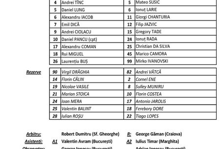 Rezerve: Vâtcă, Tiago Lopes, C. Ene, Muniru, Jakolis, Costea, Dore