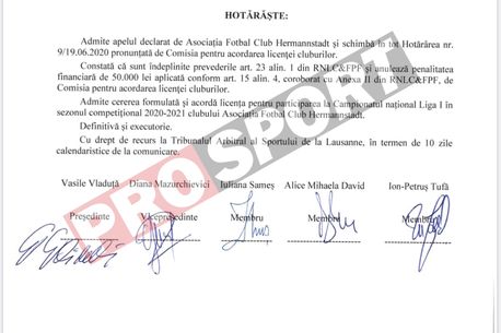 „Admite apelul declarat de Asociația Fotbal Club Hermannstadt și schimbă în tot Hotărârea nr. 9/19.06.2020 pronunțată de Comisia pentru acordarea licenției cluburilor. Constată că sunt îndeplinite prevederile art. 23 alin. 1 din RNLC & FPF și anulează penalitatea financiară de 50.000 lei aplicată conform art. 15 alin. 4, coroborat cu Anexa II din RNLC & FPF, de Comisia pentru acordarea licenței cluburilor. Admite cererea formulată și acordă licența pentru participarea la Campionatul național Liga 1 în sezonul competițional 2020-2021 clubului Asociația Fotbal Club Hermannstadt. Definitvă și executorie. Cu drept de recurs la Tribunalul Arbitral al Sportului de la LAusanne, în termen de 10 zile calendaristice de la comunicare”, se arată în documentul emis de către Comisia de Licențiere.