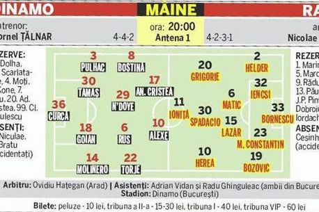 Fostul portar al Farului va fi pentru prima oară titular în campionat, chiar în derby-ul cu Rapid. Meciul cu Galatasaray a făcut mai multe victime în primul „11" al lui Dinamo pentru partida cu Rapid. Cea mai importantă schimbare va avea loc între buturi, căpitanul Emilian Dolha urmând să fie lăsat pe bancă. În locul său va intra George Curcă, practic un debutant în Liga I în tricoul „câini