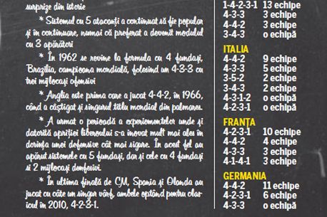 Liderul Dinamo a adoptat o tactică pe care o mai folosesc câteva echipe din Bundesliga, precum Werder Bremen sau Bayer Leverkusen, iar Voința Sibiu este singura echipă din Liga I care joacă cu trei fundași, exact ca Barcelona ori Napoli. În total, există nu mai puțin de șapte echipe care folosesc sistemul 4-4-2, în timp ce sistemul ultra-ofensiv 4-3-3 apare pe foile de joc la doar trei echipe din prima ligă. Chiar și așa, rămânem cu cele mai puține goluri marcate dintre campionatele comparate (2,36 medie pe meci), în timp ce lidera rămâne Premier League (2,71).