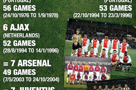 Dinamo intră în top cu marea echipă construită de Mircea Lucescu la finalul anilor 90. Cu 47 de meciuri fără înfrângere între 25 mai 1991 și 26 septembrie 1992, Dinamo ocupă un onorabil loc 9, peste fosta campioană a Europei, Nottingham Forrest.
