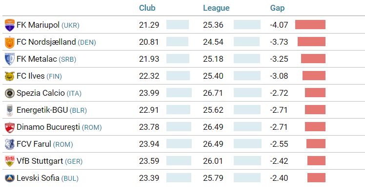 Același grup de studiu a prezentat un alt clasament în care Dinamo apare pe locul 7 la capitolul reprezentat de cele mai tinere echipe din Europa raportat la media de vârstă a campionatului în care joacă.