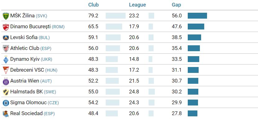 Pe locul 1 în acest top este MSK Zilina din Slovacia, care are un procent de 79,2%. Dinamo ia fața astfel cluburilor precum Levski Sofia, Athletic Bilbao sau Dinamo Kiev.