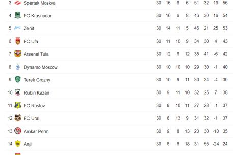 Primele 10 echipe clasate în prima ligă din Rusia: Lokomotiv Moscova, CSKA Moscova, Spartak Moscova, FC Krasnodar, Zenit, Ufa, Arsenal Tula, Dinamo Moscova, Terek Grozny și Rubin Kazan.