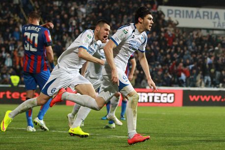 Varela și Tamaș nu l-au putut anihila pe Mihai Roman în meciul de la Târgu Jiu. Atacantul gorjenilor a deschis scorul în meciul cu Steaua. Foto: panduriics.ro