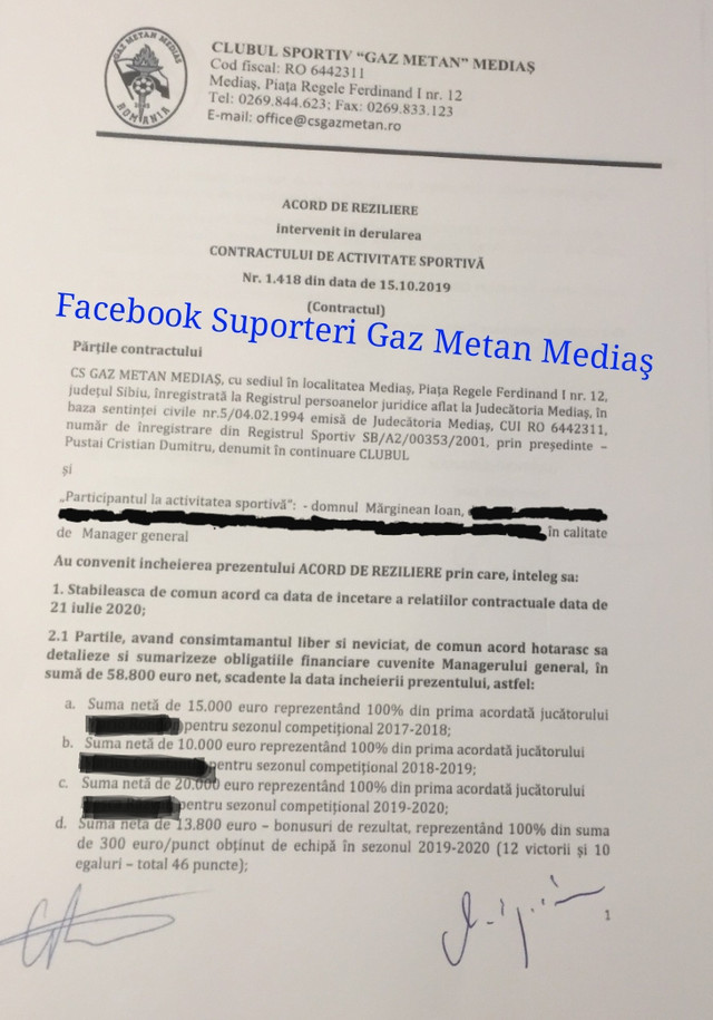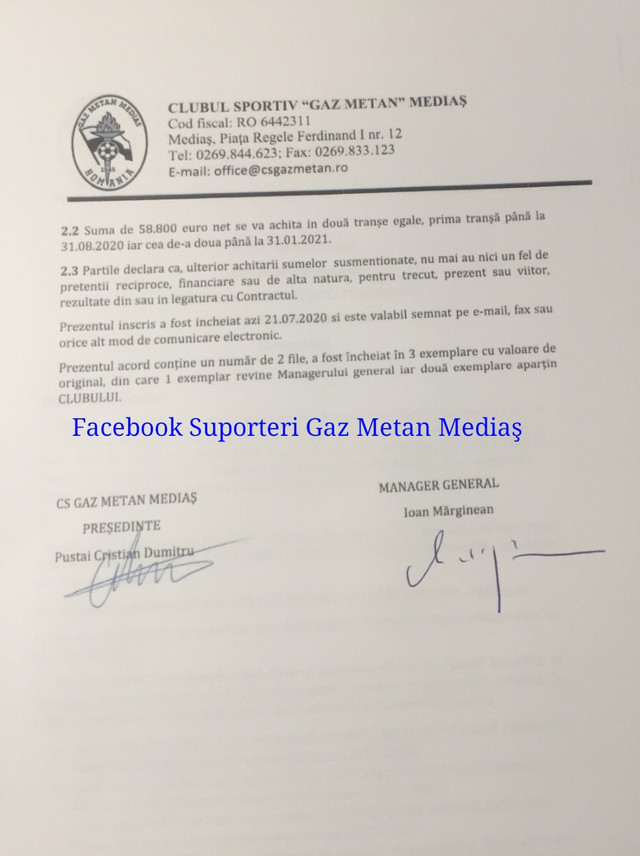 Documentul a fost publicat pe pagina de Facebook „Suporteri Gaz Metan Medias” și site-ul gaziști.ro, iar acesta reprezintă un acord de reziliere între club și Ioan Mărginean, semnat în ultimă instanță de președintele Cristi Pustai, fost antrenor la Gaz.