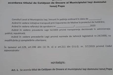 Pe cale de consecinţă şi în asentimentul tuturor suporterilor ieşeni, supunem spre dezbatere şi aprobare prezentul proiect de hotarâre privind acordarea titlului de Cetăţean de Onoare al Municipiului Iaşi domnului Ionuţ Popa”.