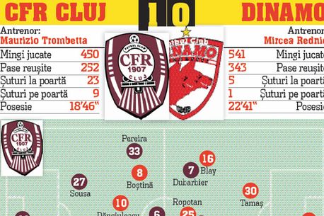 Este foarte relevantă circulația mingii la cele două echipe. Pasele CFR-ului au mers pe trasee sănătoase, cât mai direct spre poarta adversă. Astfel, fluxul de joc al ardelenilor presupune aducerea balonului în margine, la fundașii laterali, și apoi pase în jumătatea adversă, pentru mijlocașii ofensivi, demarcați cu ușurință. La Dinamo, criza de idei și de mobilitate a celor din avanposturi l-a impus pe