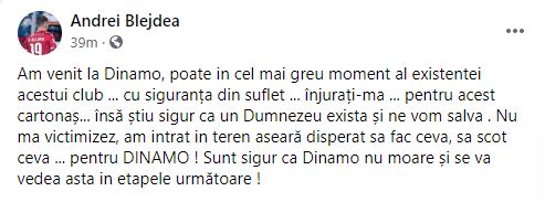 Chiar dacă șefii dinamoviști au evitat contactul cu presa și cu suporterii după meci și în ziua următoare, tânărul Andrei Blejdea a ieșit cu o reacție publică pe contul său de Facebook.