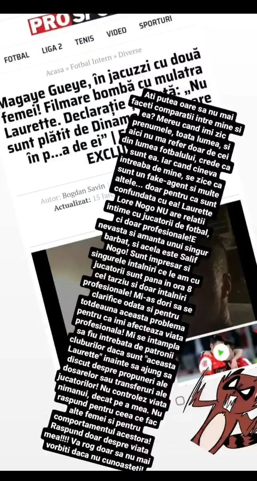 Mi-aș dori să se clarifice odată și pentru totdeauna această problemă pentru că îmi afectează viața profesională! Mi se întâmplă să fiu întrebată de patronii cluburilor dacă sunt «această Laurette» înainte să ajung să discut despre propuneri ale dosarelor sau transferuri ale jucătorilor! Nu controlez viața nimănui, decât pe a mea. Nu răspund pentru ceea ce fac alte femei și pentru comportamentul acestora! Răspund doar despre viața mea! Vă rog doar să nu mai vorbiți dacă nu cunoașteți!”, a scris Laurette Nogo, pe Instagram.