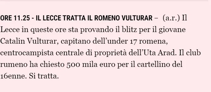 Lecce, formație retrogradată în această vară din Serie A, negociază în aceste ore transferul lui Cătălin Vulturar (16 ani), component al primei echipe a clubului UTA și căpitan al României U17, scrie Gazzetta dello Sport. Formația italiană l-a achiziționat săptămâna trecută și pe portarul Alexandru Borbei (17 ani) de la ASU Politehnica Timișoara.