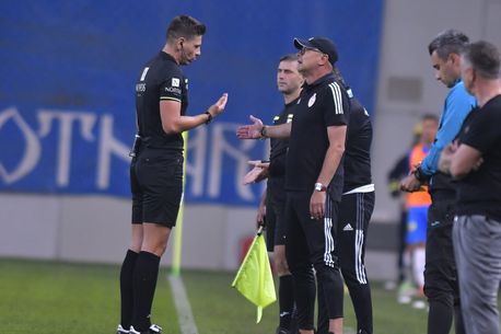 Gheorghe Hagi (S), antrenorul echipei FC Viitorul, discuta cu arbitrul Ionut Coza (D) in timpul meciului de fotbal contra echipei FC Voluntari din etapa a VIII-a a play-out-ului Ligii 1, disputat pe stadionul Anghel Iordanescu din Voluntari, luni, 6 iulie 2020. GEORGE FILIP/ MEDIAFAX FOTO