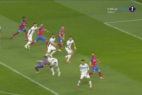 21:12 Centralul Feșnic îi nemulțumește pe vicecampioni pentru prima dată în această seară. Gnohere „ciupește” mingea din fața lui Iliev, portarul îl doboară pe francez, dar arbitrul dictează aut de poartă, la o fază după care FCSB ar fi putut marca din nou.