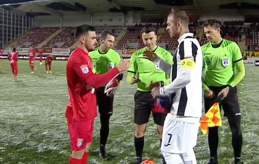 A început partida! Chindia are lovitura de start. Suprafața de joc nu este curățată în totalitate de zăpadă.