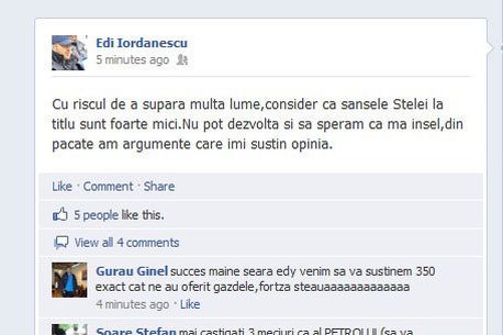 „Cu riscul de a supăra multă lume, consider că șansele Stelei la titlu sunt foarte mici. Nu pot dezvolta și să sperăm că mă înșel. Din păcate, am argumente care îmi pot confirma opinia”, e mesajul postat de Edi Iordănescu.