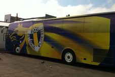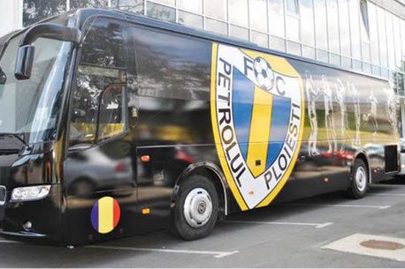 Autocarul rebranduit al clubului Petrolul Ploiești. Doar emblema mai are culorile tradiționale ele echipei.