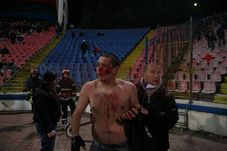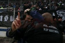Exact în acel moment a izbucnit un duel între forțele de ordine și fani. Duelul a degenerat, în lupte, chiar și bodyguard-ul lui Becali, Cătălin Zmărăndescu a luat parte la incidente. În urma luptelor un fan a leșinat, iar altul a fost umplut de sânge.