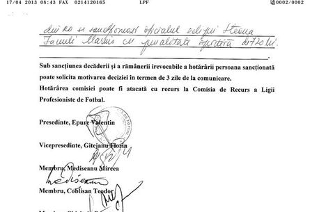 În schimb, foaia făcută publică de LPF are un rând liber în subsol, adică exact acolo unde managerul Stelei ar fi trebuit să afle în baza cărei legi a fost sancționat. Mai în glumă, mai în serios, din sediul LPF a pornit o explicație cel puțin haioasă: „S-o fi terminat pasta pixului” :).