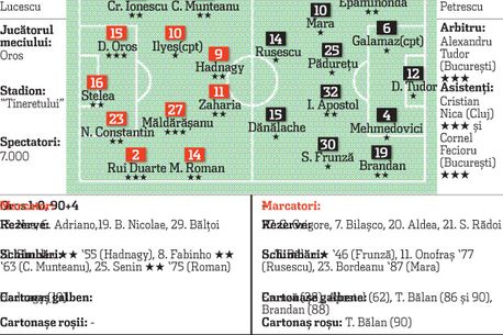 Cunoscut drept un tip intransigent și deloc carismatic, centralul Alexandru Tudor nu a făcut nici ieri notă discordantă. Bucureșteanul a fost fluierat atât la prezentarea de la începutul meciului, cât și la fazele mai importante. Cea mai aprinsă s-a consumat în minutul 19, când Hadnagy a căzut în careu după un contact cu Galamaz, însă Tudor i-a arătat galben brașoveanului pentru simulare.