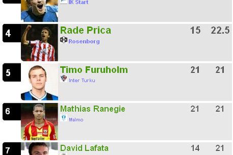Lionel Messi este pe locul 8 în acest clasament, cu 20 de puncte, pe primele trei poziții aflându-se Seydou Doumbia (24 puncte), Kerzhakov (24 puncte) și Martin Arst (22.5 puncte).