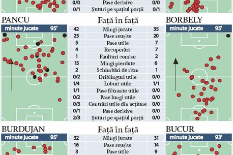Statisticile oferite azi de ProSport cuprind și analize totale, respectiv comparative, post pe post, ale jucătorilor. La total, rezultă evident că apărarea oaspeților s-a achitat bine de sarcini, ajutându-l practic pe Popa să devină jucătorul meciului. Fundașii bănățeni au recuperat 76 de mingi și au câștigat 16 dueluri aeriene, astfel că superioritatea la mijloc a giuleștenilor a devenit inutilă. Statisticile unu la unu relevă același echilibru evident în teren, rupt de golul marcat de Poli, poate de așteptat după cele 11 mingi pierdute doar de Maftei.