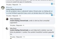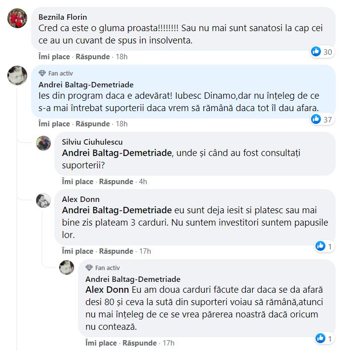 „Ies din program dacă e adevărat! Iubesc Dinamo, dar nu înțeleg de ce s-au mai întrebat suporterii dacă vrem să rămână dacă tot îl dau afară”, a scris și Andrei Baltag, un alt suporter dinamovist. La comentariul său a răspuns și Alex Don, fost membru DDB: „Eu sunt deja ieșit și plătesc sau mai bine zis plăteam cu 3 carduri. Nu suntem investitori, suntem păpușile lor”.
