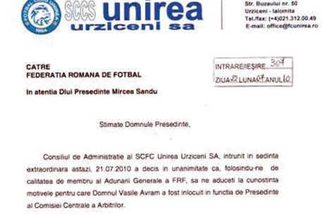 la FRF (facsimil, sus) în care acuză punctual prestația arbitrului