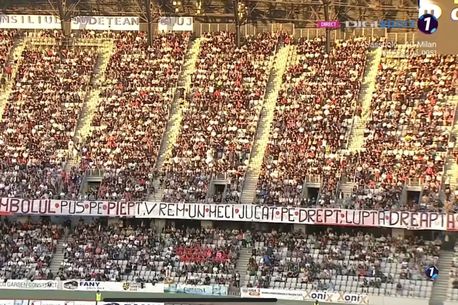 Înainte de fluierul de start al arbitrului Cătălin Popa, în tribunele stadionului din Cluj suporterii au afișat un banner imens cu aluzie la zvonurile ultimelor zile.