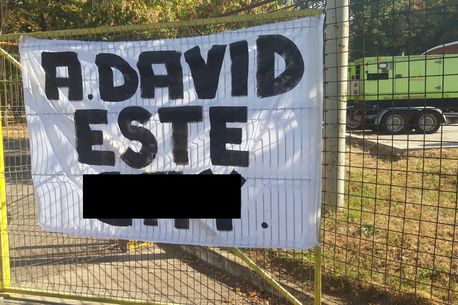 La loc vizibil față de sala de conferințe au fost afișate bannerele: „M…e Negoiță! Vinde-o și pe mă-ta”, dar și „A. David este g…y”.