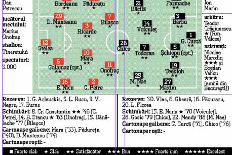 De cum a început partida s-a văzut clar tactica ultradefensivă a oaspeților. S-au așezat pe două linii în fața porții lui Curcă, au făcut marcaj om la om la cele două vîrfuri ialomițene, Onofraș și Bilașco, și au atacat buturile adverse extrem de rar.
