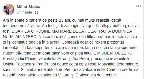 Contează doar că ne-am prezentat lamentabil în fața suporterilor care s-au întors lângă noi cu elan și speranțe. Putem să-i readucem doar dacă vom căștiga titlul. E MOMENTUL ZERO. Prestația lui Planic, venirile lui Miron și Adi Petre, precum și revenirile lui Ovidiu Popescu și Panțîru pot aduce ceea ce a lipsit. Motivație, determinare, sacrificiu. Schimbare de atitudine. Pentru că valoare este. Cine nu crede, să revadă rezumatele jocurilor cu Viitorul și Craiova din decembrie”, a scris Mihai Stoica pe contul său de Facebook.