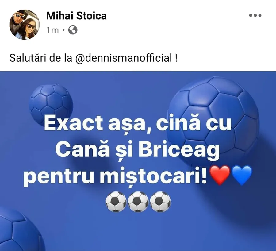 „Exact așa, cină cu Cană și Briceag pentru miștocari!”, a scris Mihai Stoica, făcând referire la fundașii lui FCSB: Ștefan Cană și Marius Briceag.