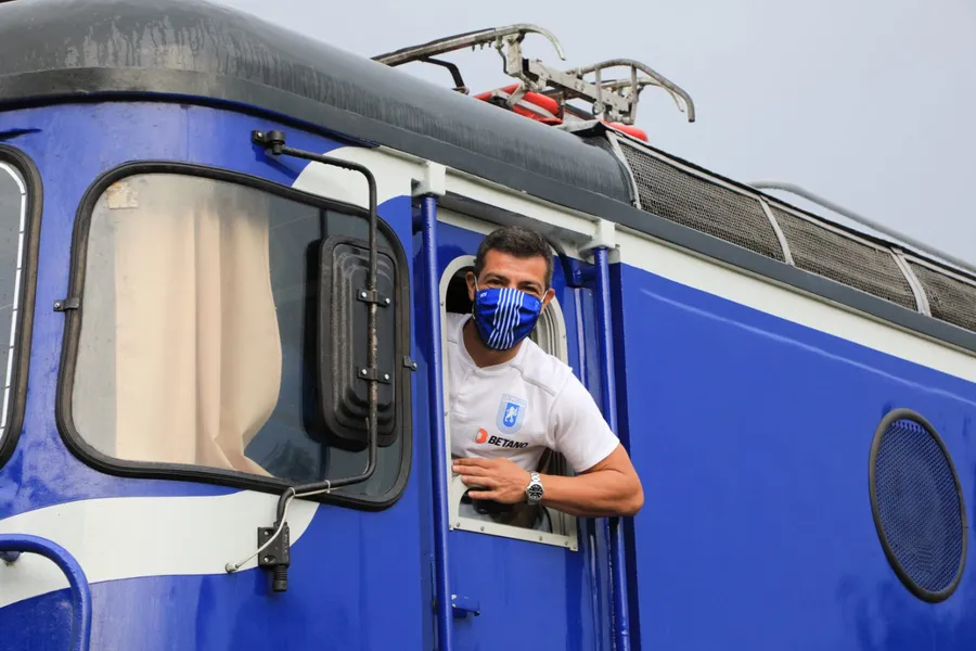 Marius Constantin şi Mirko Pigliacelli au urcat într-o locomotivă şi au fost surprinşi plăcut să întâlnească printre angajaţii fabricii suporteri extrem de pătimaşi, unul dintre ei decorându-şi bancul de lucru cu însemnele Universităţii Craiova, având inclusiv casca de lucru „personalizată” cu stema Ştiinţei.