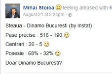 Un mesaj similar a fost postat de Mihai Stoica pe pagina de Facebook și după partida Steaua – Dinamo 1-1, când acesta a evidențiat cifrele favorabile roș-albaștrilor.