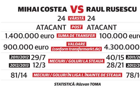 *Mihai Costea a ajuns să câștige 10.000 de euro pe lună la Steaua datorită contractului negociat în 2011 cu Valeriu Argăseală. Lui Rusescu i-au trebuit 21 de goluri în șase luni pentru a ajunge la aceiași bani