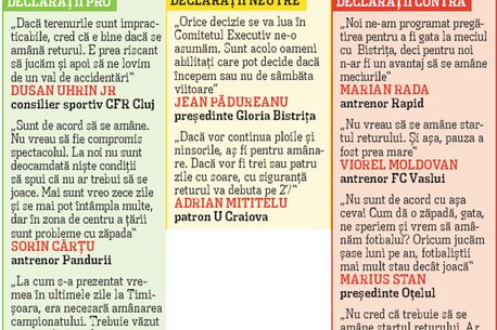 „Mi-aș dori ca returul să se amâne. Dar să ținem cont și de faptul că doar aici ninge, la București e timpul bun”, a spus Balint după ce echipa sa s-a luptat cu nămeții. Și CFR Cluj s-a declarat de acord cu amânarea, prin vocea lui Dusan Uhrin jr. Ei bine, ieri a început să ningă și în alte părți ale țării, lucru care a mai convins încă un club, Pandurii Târgu Jiu. Momentan însă, începerea returului pe 27 februarie nu pare pusă în pericol. Direcția de acțiune e următoarea: cluburile trebuie să facă o sesizare către FRF și LPF, iar Comitetul Executiv al Federației va decide dacă e cazul să se treacă pe ordinea de zi această problemă.