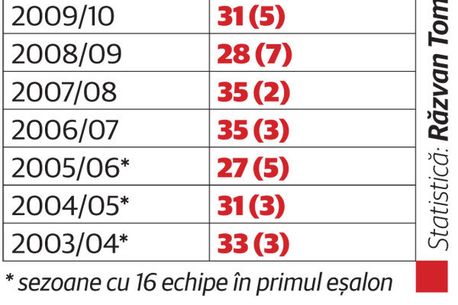 Iar problemele enumerate mai sus sunt reflectate perfect în clasamentul Ligii I. La sfârșitul turului care se încheie astăzi, în cele 17 partide scurse, Rapidul a strâns doar 26 de puncte. Linia de clasament din dreptul echipei lui Rada este extrem de tristă: șapte victorii, cinci egaluri și cinci înfrângeri. Practic, acesta este cel mai slab punctaj din ultimii 10 ani, acum, feroviarii având o zestre mai săracă decât în anii în care Liga I era formată din 16 echipe. Situație oarecum asemănătoare s-a mai înregistrat în sezonul 2008-2009, atunci când pe bancă se afla portughezul Jose Peseiro și Rapid a ocupat, la finalul turului, locul șapte (28 puncte), iar la sfârșitul campionatului a mai pierdut o poziție. De asemenea, și în 2005-2006 vișiniii au înregistrat puține puncte, mai precis 27. Era primul mandat al lui Răzvan Lucescu, iar în acel sezon, rapidiștii au ajuns până în sferturile cupei UEFA și au terminat campionatul pe locul al doilea.