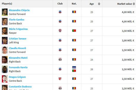 După ultima actualizare făcută de Transfermarkt, primii în top sunt steliștii Alexandru Chipciu și Florin Gardoș, a căror cotă a ajuns la 4 milioane de euro, ca urmare a prestațiilor din retur.