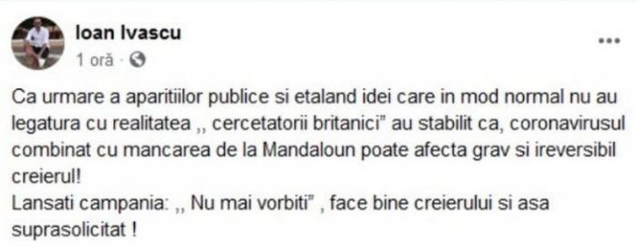 „Ca urmare a aparițiilor publice și etalând idei care în mod normal nu au legătură cu realitatea, ‘cercetătorii britanici’ au stabilit că coronavirusul, combinat cu mâncarea de la Mandaloun, poate afecta grav și ireversibil creierul. Lansați campania: ‘Nu mai vorbiți’, face bine creierului și așa suprasolicitat!”, a scris Ioan Ivașcu pe Facebook. El și-a șters ulterior postarea.