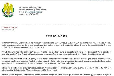 Comandantul Clubului Sportiv al Armatei „Steaua” și reprezentanții S.C. FC Steaua București S.A. au semnat miercuri, 14 martie, Acordul cadru pentru prestări de servicii privind organizarea de evenimente sportive în competițiile interne în cadrul Complexului Sportiv Ghencea, încheiat pentru perioada 14 martie 2012-30 iunie 2013.