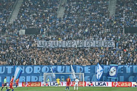 Dacă pe teren jocul a fost unul echilibrat, în tribune fanii olteni au făcut spectacol din primul minut până la final. Înainte de fluierul de start al lui Istvan Kovacs, fanii au făcut o coregrafie cum rar se vede pe stadionele din România, iar bannerele ironice nu au lipsit.