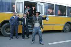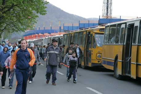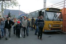 semn, ușile se deschid, și din autobuze coboară circa 500 de