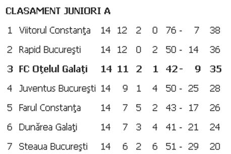 Dacă în prima ligă, Oțelul s-a clasat, în prima parte a campionatului, doar pe locul 13, în rândul juniorilor, gălățenii spulberă orice adversară și întăresc ideea că Centrul de Copii și Juniori ai Oțelului scoate talente pe bandă rulantă. Mai precis, runda a XIV-a a Campionatelor Naționale de Juniori, ultima din anul 2012, a fost una entuziasmantă pentru formațiile clubului Oțelul. Gălățenii au învins la scor (4-0 și 6-1) reprezentantele grupării Delta Tulcea în meciurile desfășurate duminică pe stadionul adversarelor. Iată cifrele din Seria a III-a a campionatului.