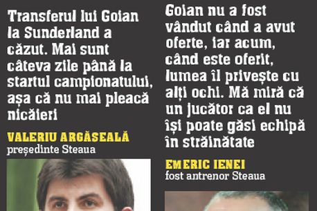 Între timp, singurele echipe care au negociat cu Steaua termenii unui transfer au fost Sunderland și Dinamo Kiev. După ce britanicii au renunțat la idee din cauza TVA-ului pe care erau nevoiți să-l plătească statului român, Goian a primit ieri o nouă lovitură. „Nu ne mai interesează fundașul Stelei!“, ne-a declarat Igor Surkis, patronul lui Dinamo Kiev.