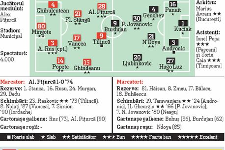 Echilibrat a fost și meciul de aseară, însă în mediocritate, jucătorii părând implicați într-un concurs de pase laterale și degajări în tușă. Spre deosebire de Vaslui, care n-a avut nicio ocazie de poartă până spre mijlocul reprizei secunde, gorjenii au mai încercat câte ceva, speculând și greșelile fundașilor moldoveni. Nemulțumit, Hizo a schimbat sistemul de joc odată cu introducerea pe teren a lui Temwanjera, oaspeții trecând de la 4-2-3-1 la 4-4-2. Rezultatul? Vasluiul a echilibrat jocul și fazele de poartă au cam dispărut, lăsând loc protestelor gazdelor la adresa arbitrului Marius Avram. Jocul s-a animat spre final, când echipele au intrat în criză de timp și a trebuit să riște. Gazdele au avut câștig de cauză, golul lui Alex Pițurcă dovedindu-se decisiv.