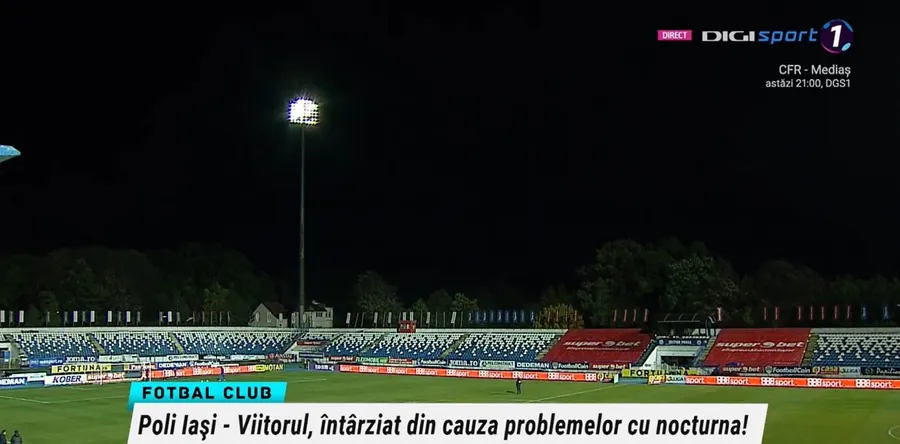 UPDATE: „A făcut o flamă la un stâlp și încercăm să remediem problemele la unul dintre ele. Au mers trei, un stâlp a făcut flamă. Probabil că, daca va fi în interiorul stâlpului, nici nu ai ce să faci. Ar fi o problemă foarte mare pentru noi, dacă pierdem meciul. Doamne ferește!”, a reacționat președintele Poli Iași, Ciprian Paraschiv, la Digi Sport.