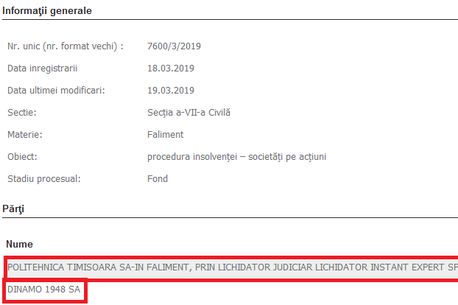 Dacă instanța le va da dreptate timișorenilor, societatea Dinamo 1948 SA va intra în faliment. În cazul lui Dinamo se judecă în continuare și ieșirea din insolvență. Pe 19 aprilie va avea loc o nou înfățisare în cazul ieșirii lui Dinamo din insolvență, în timp ce pentru cererea de faliment nu a fost fixat un termen de judecată.