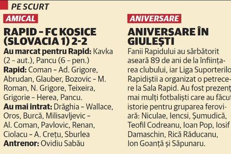 Pe de altă parte, rapidiștii sunt primii care vor intra în lupta pentru calificarea în grupele Europa League. Astăzi, la Nyon (Elveția), de la ora 15:00, giuleștenii vor afla adversarul din turul II preliminar. Printre posibilii adversari se află și gruparea letonă Skonto Riga, care, în sezonul 1999-2000, a eliminat Rapidul pregătit de Mircea Lucescu din preliminariile Ligii Campionilor (1-2 în deplasare, 3-3 acasă). De asemenea, pe teren în dubla cu cei de la Skonto Riga s-a aflat și actualul antrenor giuleștean, Ovidiu Sabău, care speră că va reuși să răzbune eliminarea rușinoasă din urmă cu 13 ani, dacă va fi să dea iar piept cu letonii.
